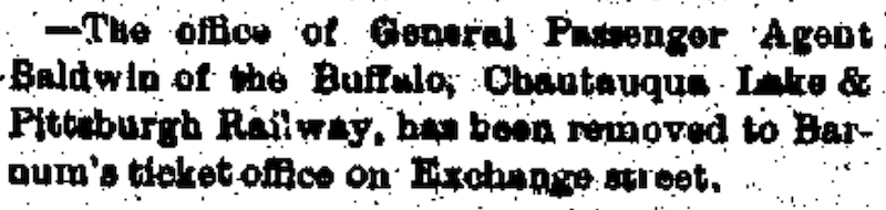 The office of General Passenger Agent Baldwin of the Buffalo, Chautauqua Lake & Pittsburgh Railway, has been removed to Barnum’s ticket office on Exchange street.