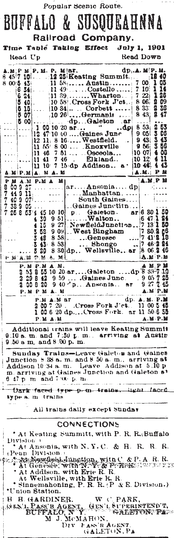 By New Years Day of 1896 the B&S ran trains the 37-miles from Galeton to Wellsville, NY. In 1898 the brothers purchased the Addison and Pennsylvania Railroad running from Galeton, PA to Addison, NY. The company began expanding the opposite direction and by 1900 was operating into Sinnemahoning, PA where it connected to the Philadelphia and Erie Railroad (later part of the Pennsylvania system). South of Galeton the line ran through a series of switchbacks to climb the mountains. These switchbacks, later abandoned, limited the trains to 15 cars.