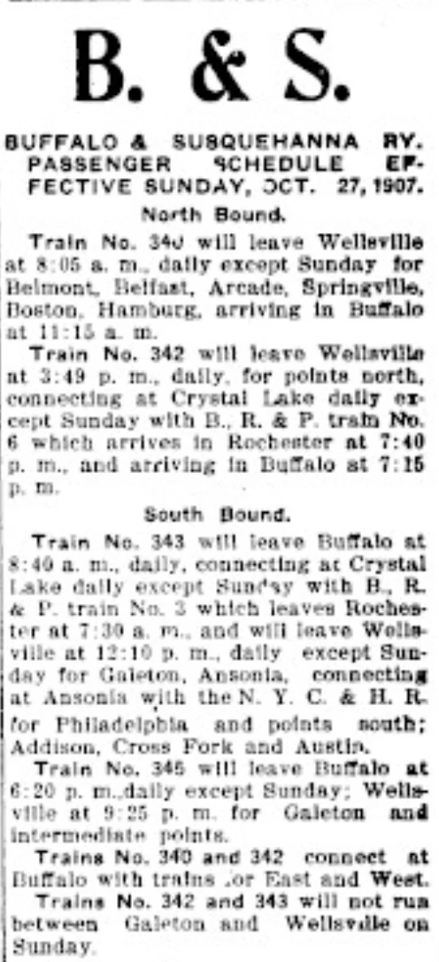 H. I. Miller continued to operate the rest of the line as chairman of the board until 1932 when it was purchased by the Baltimore & Ohio Railroad. In July 1942 a flood washed out the track south of Galeton leaving the rest of the former B&S separated from the B&O. In 1954 the B&O merged the B&S with two smaller railroads it had leased since the turn of the century. In 1956 the Wellsville – Addison – Galeton section was sold to Murray Salzberg who operated it as the Wellsville, Addison and Galeton Railroad until the WAG’s demise in 1979.
