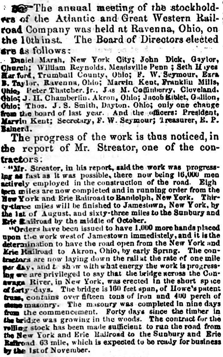 The following article about the annual meeting of the stockholders of the Atlantic and Great Western Railroad is from the July 19, 1860 issue of The Railroad Record magazine. Much of the report is based on the report of the work of the contractor building the line westward from the New York and Erie Railroad connection at Salamanca, NY. The road had been completed to Randolph and was expected to be completed to Jamestown by August 1, 1860 and to the connection with the Sunbury and Erie Railroad in Pennsylvania by October.