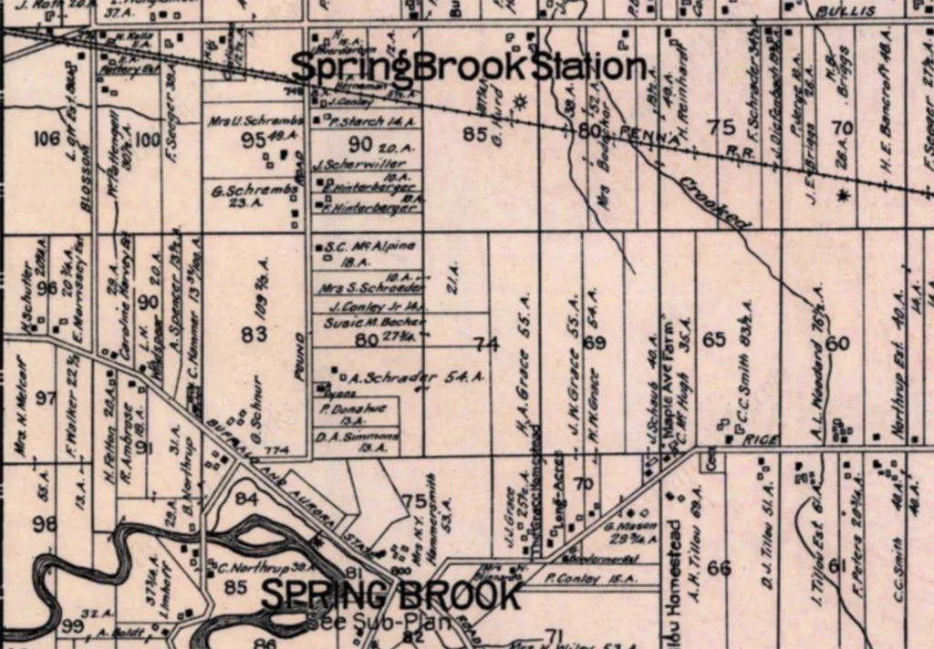In August 1891, Charles W. Harrah of Detroit purchased 80 acres of land near the Spring Brook station and laid out a housing development over over 900 lots. To bring potential buyers out, he arranged for people to ride for free on the Western New York and Pennsylvania Railroad from Buffalo to Spring Brook on Thursday, September 17th, Saturday, September 19th and Tuesday, September 22nd to see and purchase lots, which were priced between $17 and $35. He ran the free trains again on September 28th and October 1st, 17th and 23rd. By the end of October he had sold 808 of the 923 lots. Despite the many people who purchased the lots, only two families actually moved out to Spring Brook.