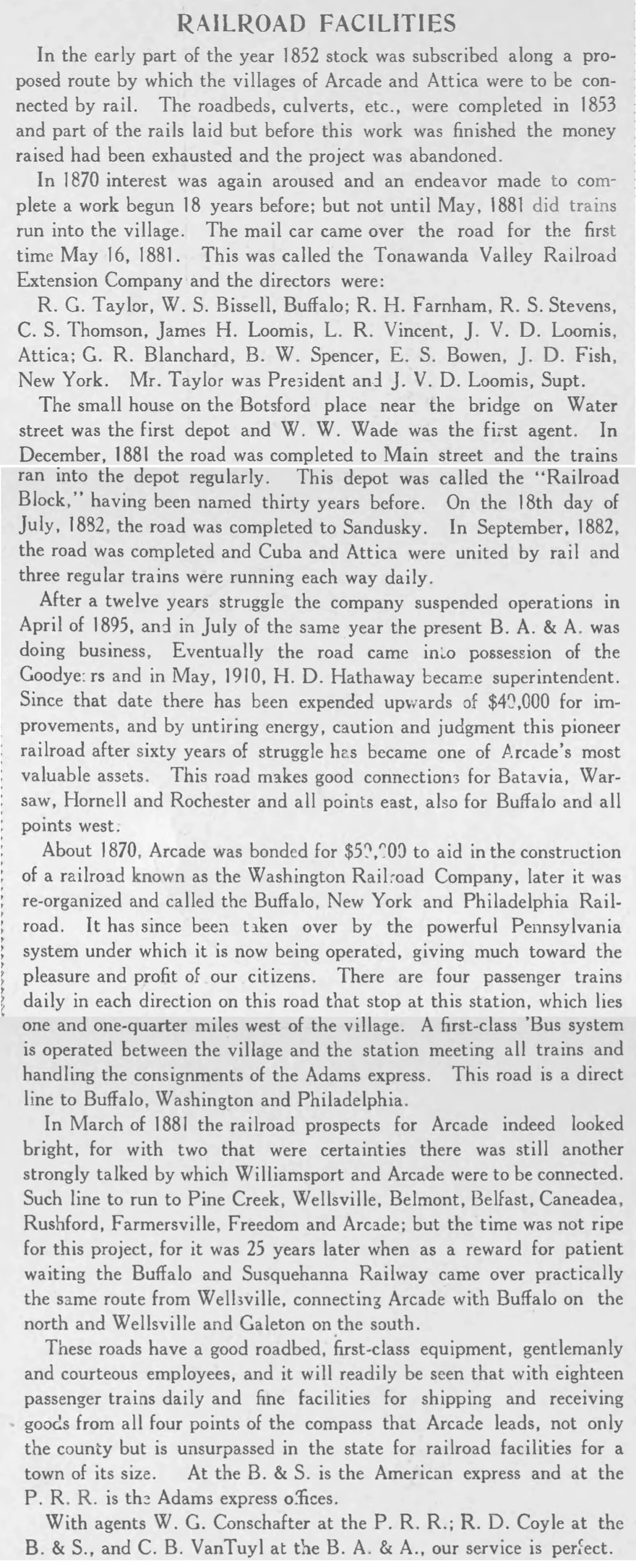 About 1870, Arcade was bonded for $50,000 to aid in the construction of a railroad known as the Washington Railroad Company, later it was re-organized and called the Buffalo, New York and Philadelphia Railroad. It has since been taken over by the powerful Pennsylvania system under which it is now being operated, giving much toward the pleasure and profit of our citizens.