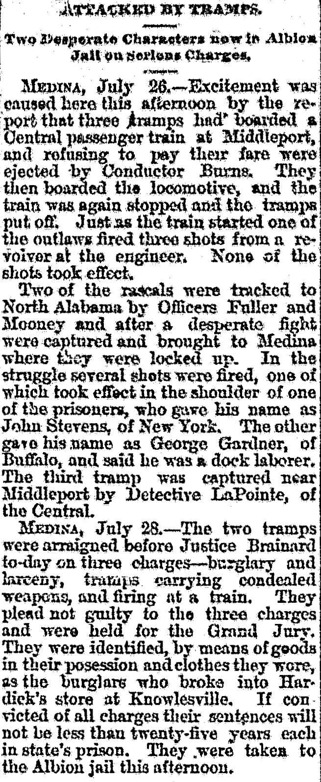 An article about three tramps who attacked a New York Central Railroad train near Middleport, NY.