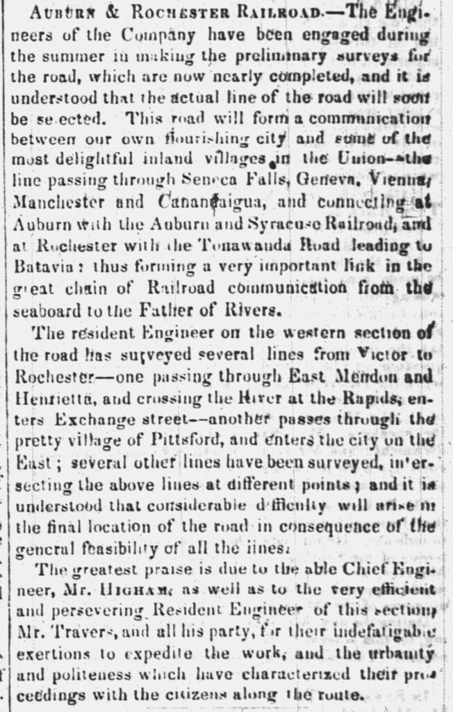 A September 19, 1837 article about the planned route of the Auburn and Rochester Railroad between Auburn and Rochester, NY.