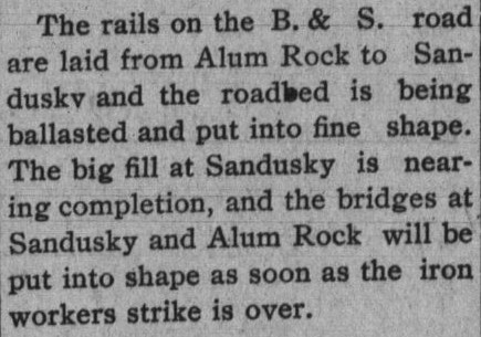 The rails on the B. & S. road are laid from Alum Rock to Sandusky and the roadbed is being ballasted and put into fine shape. The big fill at Sandusky is nearing completion, and the bridges at Sandusky and Alum Rock will be put into shape as soon as the iron workers strike is over.