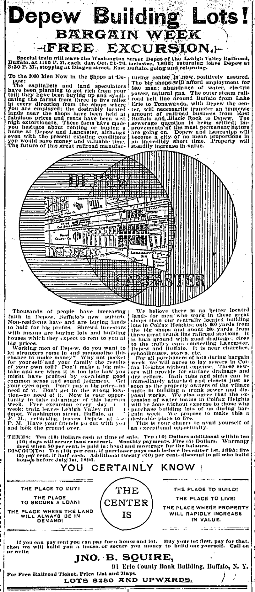 This October 1895 advertisement announced a special train leaving Buffalo on the Lehigh Valley Railroad to take potential buyers of land in the new suburb of Depew. It exhorted the 3000 men now working at the shops in Depew to buy plots of land now before the capitalists and land speculators.