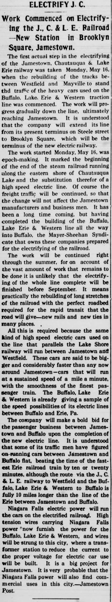 The first actual step in the electrifying of the Jamestown, Chautauqua & Lake Erie railway was taken Monday, May 16, when the rebuilding of the tracks between Westfield and Mayville to stand the traffic of the heavy cars used on the Buffalo, Lake Erie & Western traction line was commenced. The work will progress gradually down the line, ultimately reaching Jamestown. It is understood that the company will extend its line from its present terminus on Steele street to Brooklyn Square, which will be the terminus of the new electric railway.