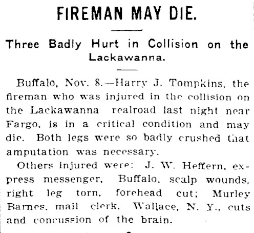 Buffalo, Nor. 8.-Harry J. Tompkins, the fireman who was injured in the collision on the Lackawanna railroad last night near Fargo, is in a critical condition and may die. Both legs were so badly crushed that amputation was necessary. Others injured were: J. W. Heffern, express messenger, Buffalo, scalp wounds, right leg torn, forehead cut; Murley Barnes, mail clerk, Wallace, N. Y., cuts and concussion of the brain.
