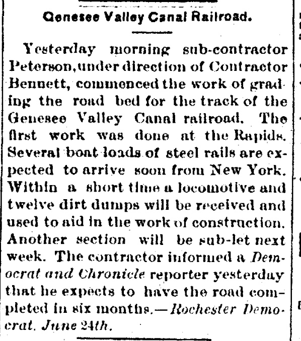 Yesterday morning sub-contractor Peterson, under direction of Contractor Bennett, commenced the work of grading the road bed for the track of the Genesee Valley Canal railroad. The first work was done at the Rapids. Several boat loads of steel rails are expected to arrive soon from New York. Within a short time a locomotive and twelve dirt dumps will be received and used to aid in the work of construction. Another section will be sub-let next week. The contractor informed a Democrat and Chronicle reporter yesterday that he expects to have the road completed in six months.—Rochester Democrat. June 24th.