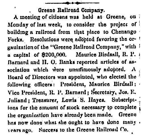 A meeting of citizens was held at Greene, on Monday of last week, to consider the project of building a railroad from that place to Chenango Forks. Resolutions were adopted favoring the organization of the “Greene Railroad Company,” with a capital of $200,000.
