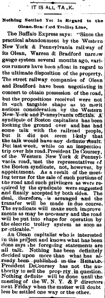 The Buffalo Express says: “Since the practical abandonment by the Western New York & Pennsylvania railway of its Olean, Warren & Bradford narrow gauge system several months ago, various rumors have been afloat in regard to the ultimate disposition of the property. The street railway companies of Olean and Bradford have been negotiating in concert to obtain possession of the road, but the propositions received were not in such tangible shape to merit serious consideration by the Western Now York and Pennsylvania officials. A syndicate of Boston capitalists bas been looking the ground over and has had some talk with the railroad people, but it did not seem likely that the talk would have any definite result. But last week, while on an inspection trip over his road. President De Coursey, of the Western New York & Pennsylvania road, met the representatives of the Boston syndicate, not, however, by appointment. As a result of the meeting terms for the sale of such portions of the road and such privileres as were required by the syndicate were suggested and finally accepted by both sides. The deal, therefore, is arranged and the transfer will be made in due course. The syndicate will make such improvements as may be necessary and the road will be put into shape for operation by the electric trolley system as soon as is practicable.”