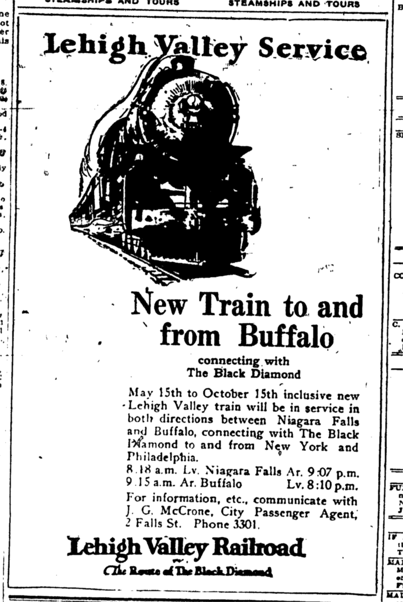 An advertisement of a new Lehigh Valley Railroad train operating in the summer of 1925 between Buffalo and Niagara Falls, NY.