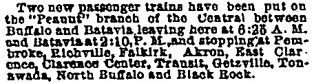 Two new passenger trains have been put on the “Peanut” branch of the Central between Buffalo and Batavia leaving here at 6:25 A.M. and Batavia at 2:10 P.M., and stopped at Pembroke, Richville, Falkirk, Akron, East Clarence, Clarence Center, Transit, Getzville, Tonawanda, North Buffalo and Black Rock.