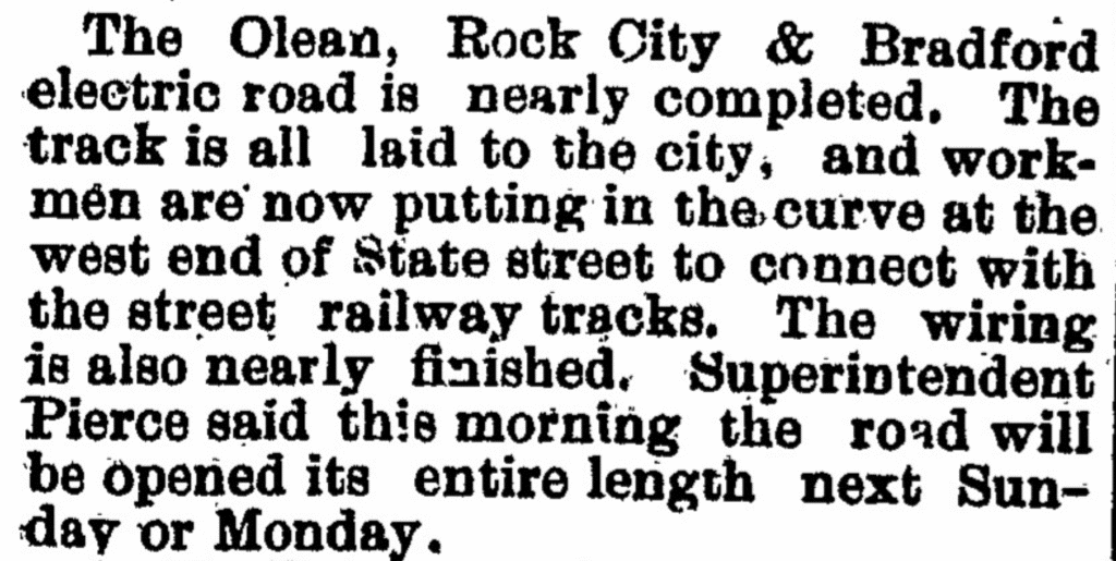 The Olean, Rock City & Bradford electric road is nearly completed. The track is all laid to the city, and workmen are now putting in the curve at the west end of state street to connect with the street railway tracks. The wiring is also nearly finished. Superintendent Pierce said this morning the road will be opened its entire length next Sunday or Monday.