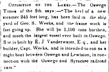 This small February 1848 article discusses a steam ship being built in Oswego, NY that will run between Owego and Lewiston, NY. The ship will be operated in cooperation with the Oswego and Syracuse Railroad.