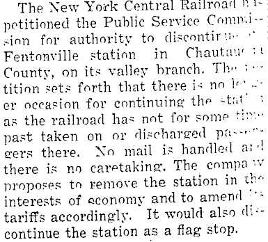 This 1929 article notes the petition of the New York Central Railroad to halt stops at the Fentonville station in Chautauqua County. For many years this line was operated by the Dunkirk, Allegheny Valley and Pittsburgh Railroad (the “valley branch” referenced in the article).