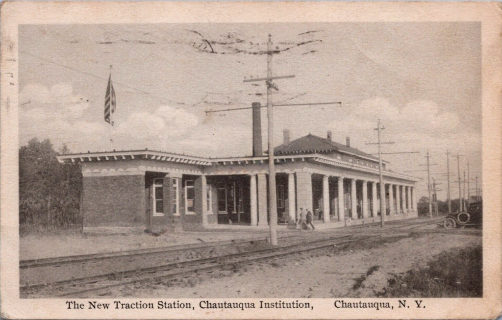 The original station at the Chautauqua Institution was a wood structure that extended over the tracks. It was replaced in 1917 by a new brick station with a more classical character, complete with columns. This station remains as the main entrance to the Institution.
