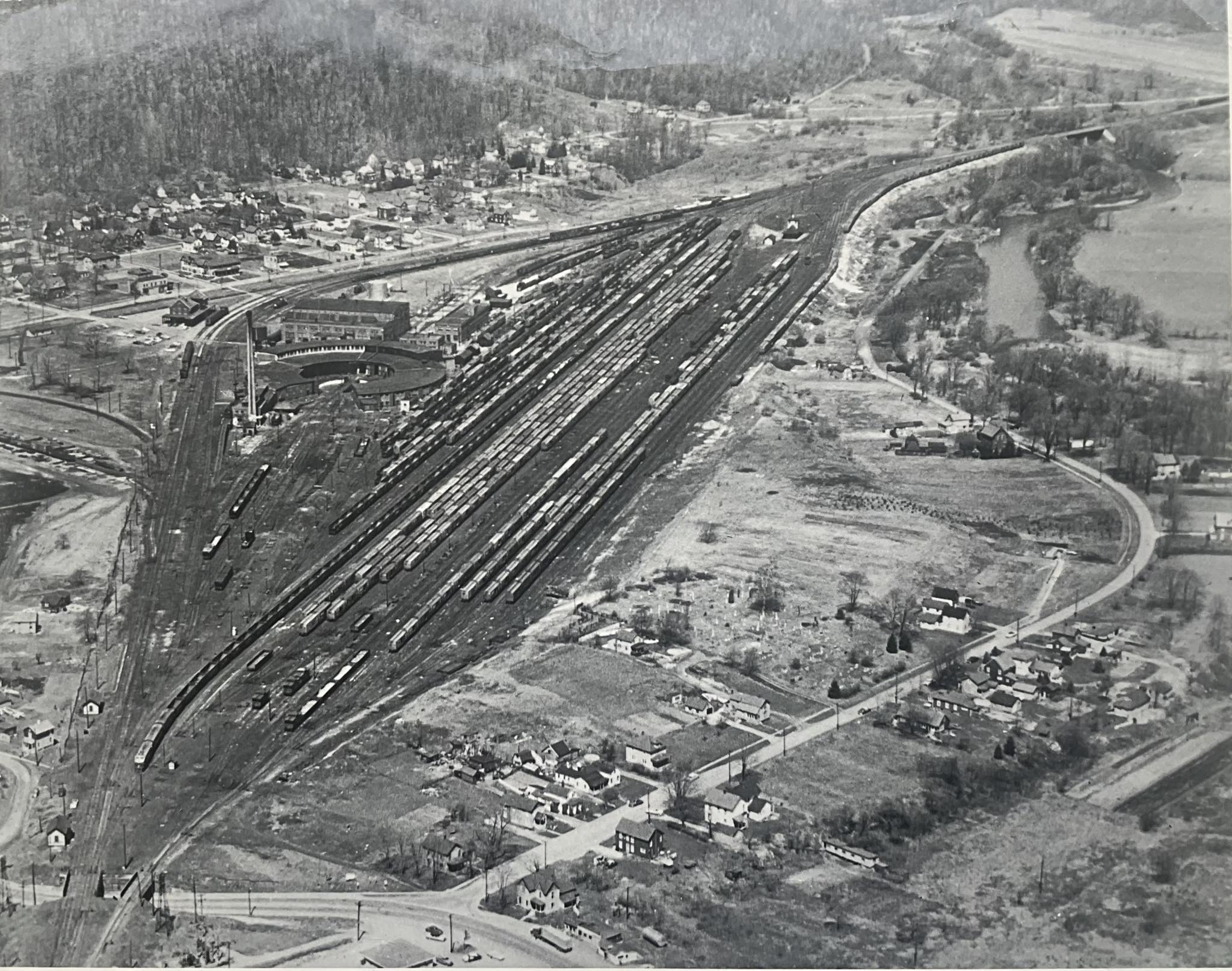 An aerial view taken in 1958 of the Baltimore and Ohio Railroad (formerly Buffalo, Rochester and Pittsburgh Railway) yard in in East Salamanca, NY. Stan Carlson collection, Flickr.com.