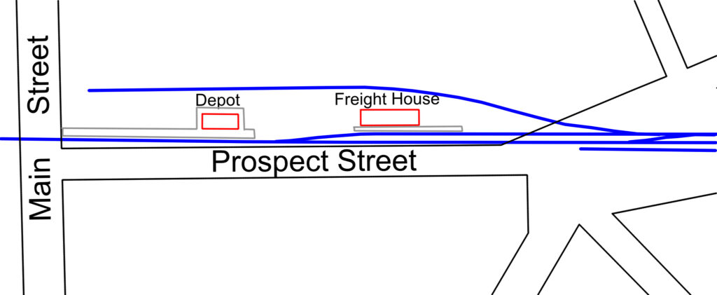 The DAV&P passenger station and freight house were located on the east side of Prospect Street south of Main Street. The freight house still stands and can be found here.