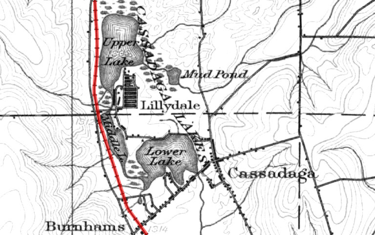 Lily Dale (also spelled “Lilly Dale” or “Lilydale”) is a Spiritualist community near the village of Cassadaga, NY. It was a popular excursion destination on the on the Dunkirk, Allegheny Valley and Pittsburgh Railroad.