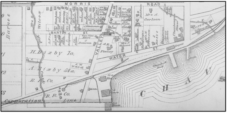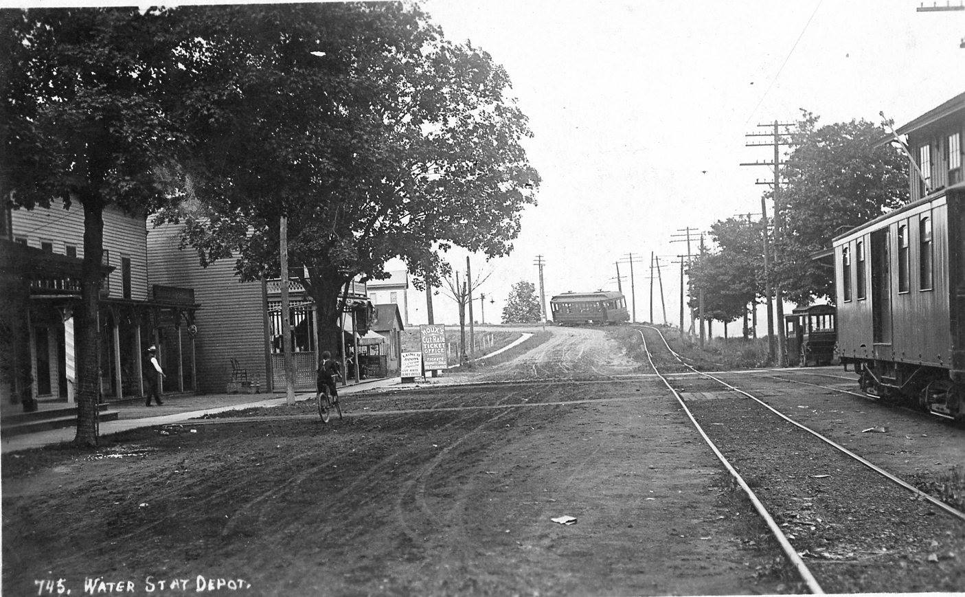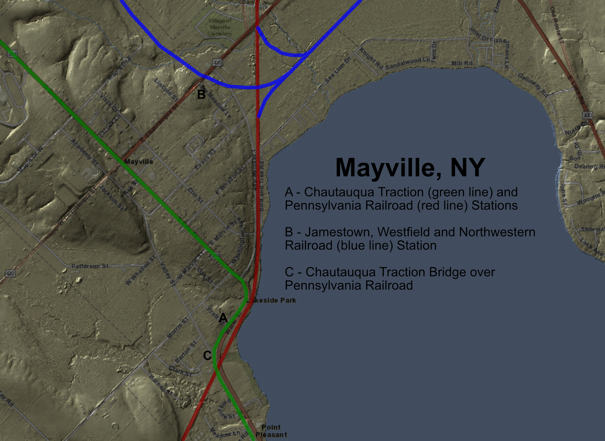 Mayville was also served by the Jamestown, Westfield and Northwestern Railroad which ran along the east side of Chautauqua Lake and Chautauqua Traction Company electric interurban line which ran along the west side of the lake and through downtown. Both companies ran north from Mayville to Westfield (with the Chautauqua Traction extending to Barcelona on the shores of Lake Erie).