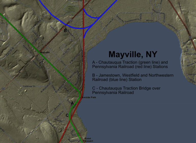Mayville is the county seat of Chautauqua County, NY and was a station on the Pennsylvania Railroad‘s Chautauqua Branch, formerly the Western New York and Pennsylvania Railroad. It was also served by the Jamestown, Westfield and Northwestern Railroad, and the Chautauqua Traction interurban electric railroad.