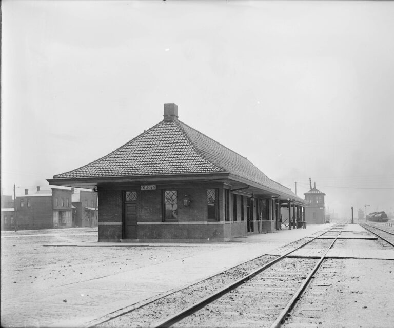 Olean was the western terminal for the Pittsburg, Shawmut and Northern Railroad. This line began in 1881 as the narrow-gauge Olean Railroad that extended east through Ceres to Bolivar. The line went through a series of ownership changes, eventually becoming the Pittsburg, Shawmut and Northern.