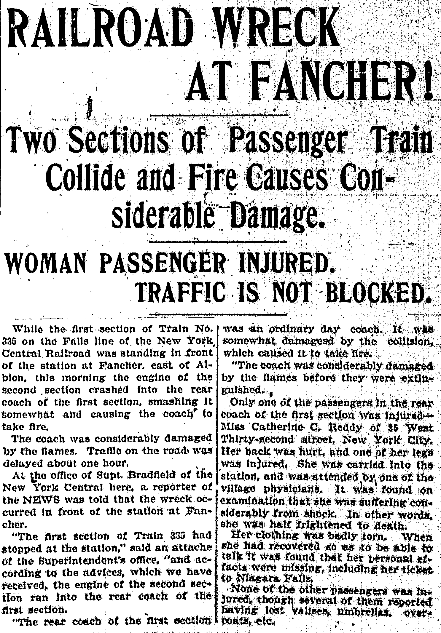 At the office of Supt. Bradfield of the New York Central here, a reporter of the NEWS was told that the wreck occurred in front of the station at Fancher.