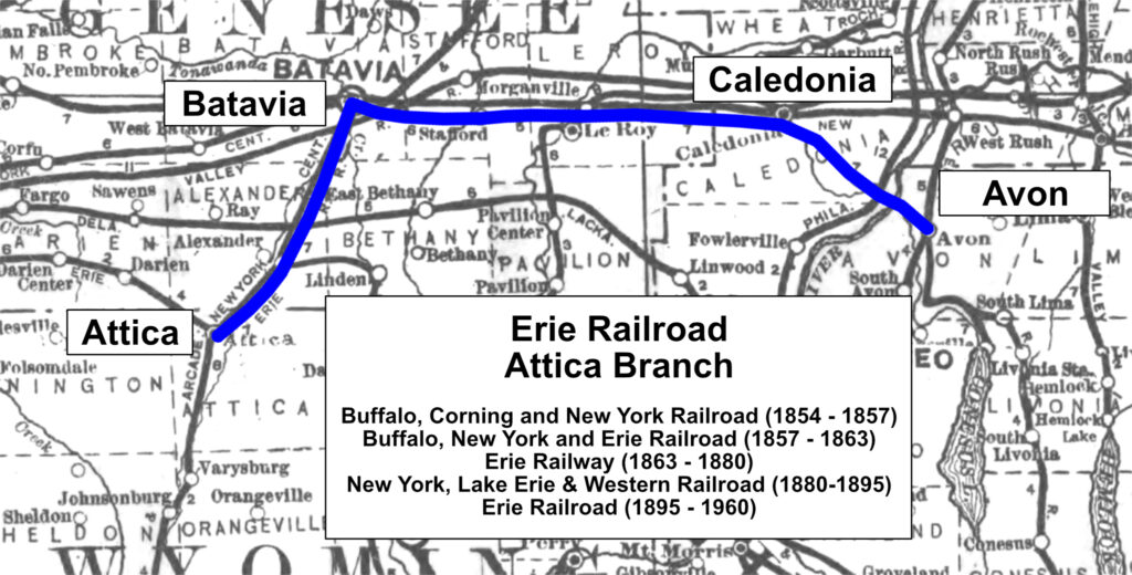 1854: The Buffalo, Corning and New York Railroad (BC&NY) completed and began operating the 110 mile line between Corning and Attica via Avon and Batavia, NY. The Avon – Batavia – Attica section would become the Attica Branch.