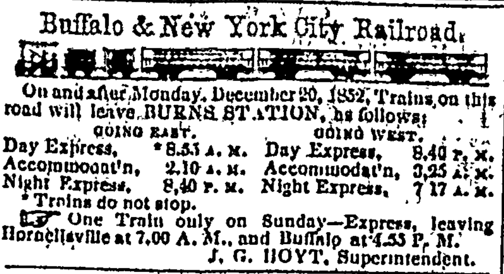The Attica and Hornellsville Railroad was chartered on May 14, 1845 to connect Hornellsville on the New York and Erie to the railroad line that ran east from Buffalo to Attica. Work was begun on the road in the fall of 1850 and on April 15, 1851 the name of the railroad was changed to the Buffalo and New York City Railroad.