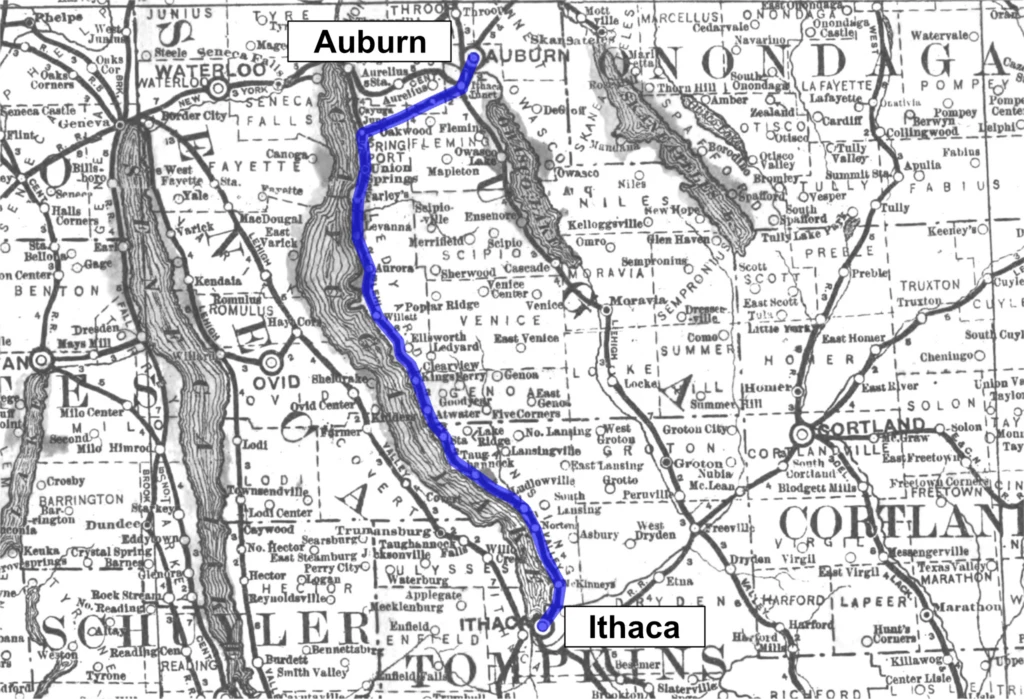 The Auburn and Ithaca Branch of the Lehigh Valley Railroad ran south from Auburn and then down the east side of Cayuga Lake until it reached Ithaca.