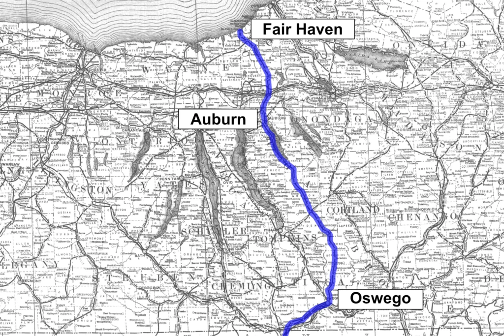 | Sayre, PA Smithboro Tioga Center Owego Flemingville Newark Valley Berkshire Richford Mills North Harford Dryden Freeville Peruton Groton Locke Moravia Cascade Ensenore Owasco Lake Auburn Throop Weedsport Brick Church Cato Ira Martville Sterling Junction Fair Haven North Fair Haven | 0 9 13.1 18.6 22.8 28.3 34 37 41.9 43.7 49.9 52.7 55.1 57.8 64.1 67.7 71.6 74.6 78.2 85.3 88.8 94.7 98.4 102.9 106.8 111.1 114.0 115.7 116.9 |