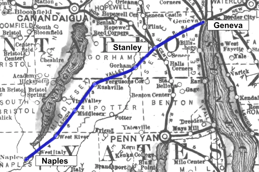 In 1871 the Geneva and Southwestern Railroad was incorporated to build a line from Geneva to Naples, approximately 30 miles to the southwest. The line was graded, but construction was halted due to the financial panic of 1873.