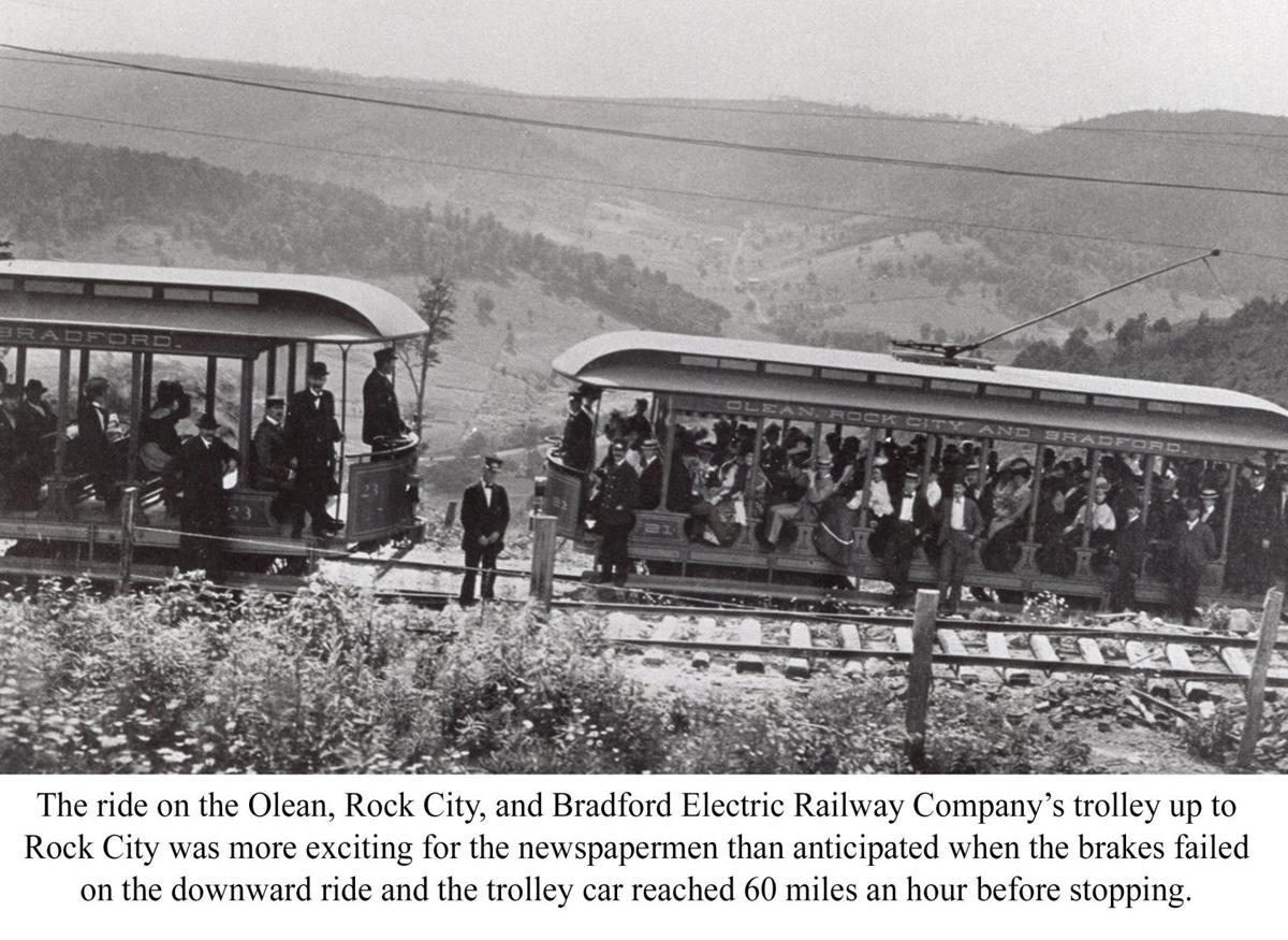 The Olean, Rock City and Bradford followed the route of the former Olean, Bradford and Warren Railroad, a steam-powered railroad that operated between Olean and Bradford between 1887 and 1896. A 1945 history of the Pennsylvania Railroad system stated that: “The operation of the line from near Hanley Street, Olean, to the Pennsylvania-New York State Line, 11.23 miles, was discontinued in August 1896 and the track sold to Olean, Rock City and Bradford Electric Railroad Company in 1897.”