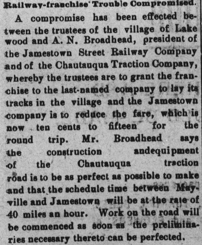 A compromise has been effected between the trustees of the village of Lakewood and A. N. Broadhead, president of the Jamestown Street Railway Company and of the Chautauqua Traction Company, whereby the trustees are to grant the franchise to the last-named company to lay its tracks in the village and the Jamestown company is to reduce the fare, which is now ten cents to fifteen for the round trip. Mr. Broadhead says the construction and equipment of the Chautauqua traction road is to be as perfect as possible to make and that the schedule time between Mayville and Jamestown will be at the rate of 40 miles an hour. Work on the road will be commenced as soon as the preliminaries necessary thereto can be perfected.