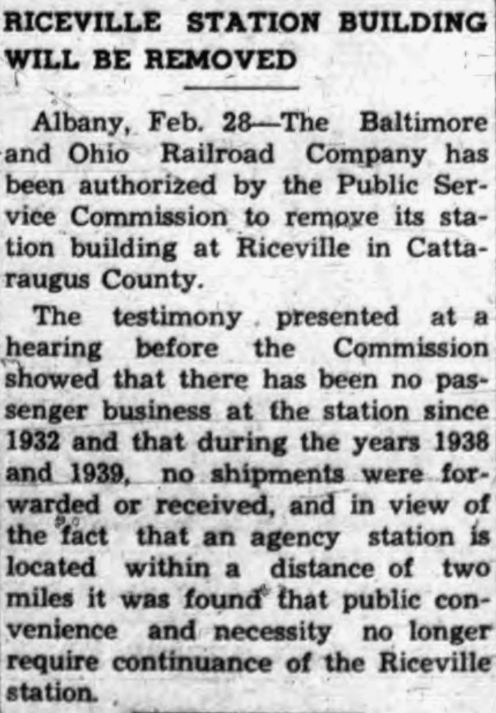 Albany, Feb. 28-The Baltimore and Ohio Railroad Company has been authorized by the Public Service Commission to remove its station building at Riceville in Cattaraugus County.