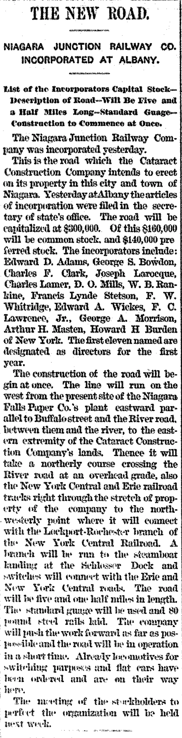 This is the road which the Cataract Construction Company intends to erect on its property in this city and town of Niagara. Yesterday at Albany the articles of incorporation were filed in the secretory of state’s office. The road will be capitalized at $800,000. Of this $160,000 will be common stock, and $140,000 preferred stock. The incorporators include: Edward D. Adams, George S. Bowdon, Charles F. Clark, Joseph Larocque, Charles Lamer, D. O. Mills, W. B. Rankine, Francis Lynde Stetson, F. W. Whitridge, Edward A. Wickes, F. C. Lawrence, Jr., George A. Morrison, Arthur H. Masten, Howard H Burden of New York. The first eleven named are designated as directors for the first year.