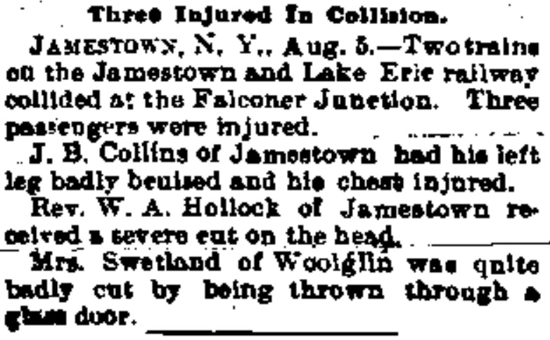 Jamestown, N. Y. , Aug, 5, – Two trains on the Jamestown and Lake Erie railway collided at the Falconer Junction. The passengers were injured.