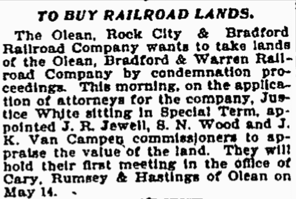 The Olean, Rock City & Bradford Railroad Company wants to take lands of the Olean, Bradford & Warren Railroad Company by condemnation proceedings. This morning, on the application of attorneys for the company, Justice White sitting in Special Term, appointed J. R. Jewell, S. N. Wood and J. K. Van Campe commissioners to appraise the value of the land. They will hold their first meeting in the office of Cary, Rumsey & Hastings of Olean on May 14.