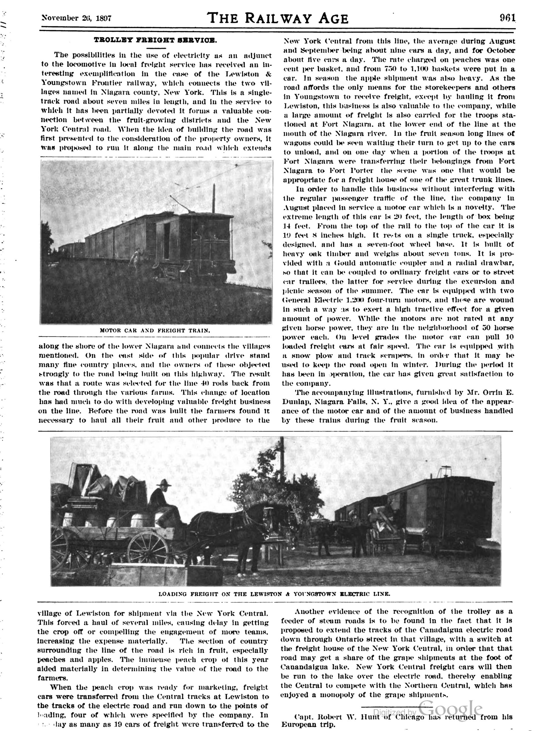 The one-page article from November 26, 1897 issue of The Railway Age magazine is a good description of the Lewiston and Youngstown Frontier Railway and its freight-hauling electric motor car.