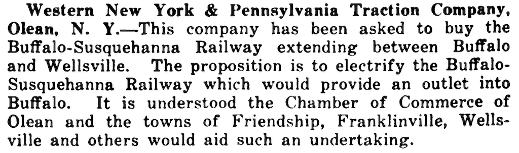 Western New York & Pennsylvania Traction Company, Olean, N. Y.-This company has been asked to buy the Buffalo-Susquehanna Railway extending between Buffalo and Wellsville. The proposition is to electrify the Buffalo-Susquehanna Railway which would provide an outlet into Buffalo. It is understood the Chamber of Commerce of Olean and the towns of Friendship, Franklinville, Wellsville and others would aid such an undertaking.