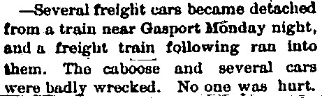 Several freight cars became detached from a train near Gasport Monday night, and a freight train following ran into them. The caboose and several cars were badly wrecked. No one was hurt.