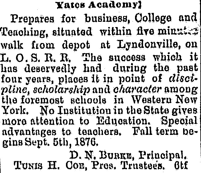 Prepares for business, College and Teaching, situated within five minutes walk from depot at Lyndonville, on L. O.S. R. R. The success which it has deservidly had during the past four years, places it in point of discipline, scholarship and character among the foremost schools in Western New York, No Institution in the State gives more attention to Education. Special advantages to teachers. Fall term begins Sept. 5th, 1876.